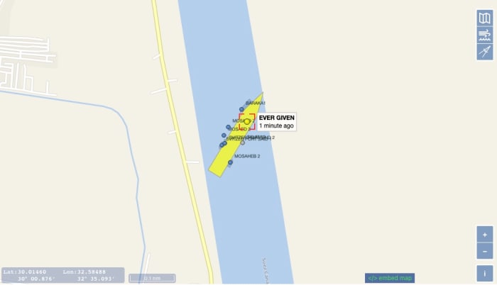 A giant container ship named ever given, owned by the evergreen company, is currently completely blocking the suez canal.